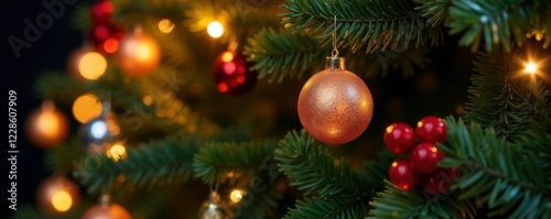 Sparkling light garland balls on a decorated evergreen tree, balls, lights