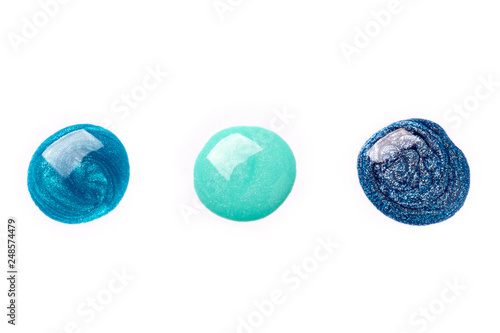 Sparkling nail polish drops blue and turquoise color isolated on white.