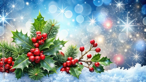 Sparkling snowflakes and festive holly adorn a merry winter wonderland scene, perfect for a festive holiday web banner or seasonal digital design element.