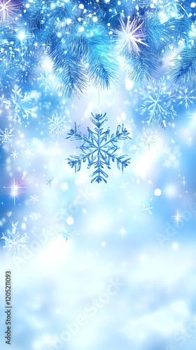 Sparkling Snowflakes Dance Beneath Icy Pine Branches in a Winter Wonderland Background.