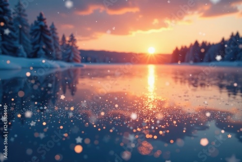Sparkling snowflakes falling on a frozen lake during sunset, frozen lake, winter wonderland, glitter christmas background
