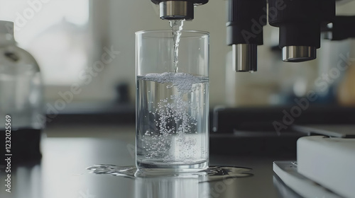 Sparkling water pouring into glass, lab setting
