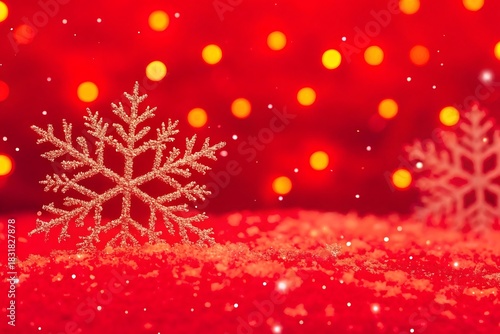 Sparkling white snowflakes on a vibrant red background with bokeh lights