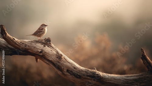 Sparrow perched on a driftwood branch in a soft, hazy light