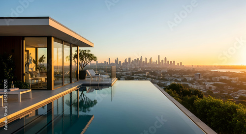 Spectacular Infinity Pool With City Skyline at Dusk On Luxurious Penthouse