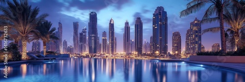 Spectacular skyline view reflected on the surface of infinity pool water