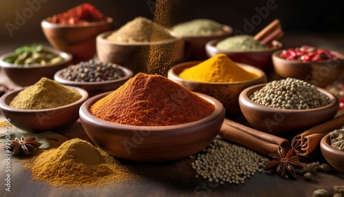 Spice Explosion in Wooden Bowls - collection of various Indian spices placed in rustic wooden bowls - paprika, curry powder, fenugreek and fennel seeds. Graphic art illustration. Ai generative