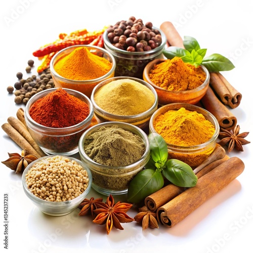 Spices and herbs. Curry, saffron, turmeric, cinnamon isolated on white background.