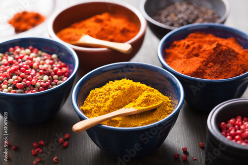 spices in bowls: curry, pink and black pepper, paprika powder