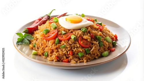 Spicy fried rice dish on white plate isolated object with leading lines