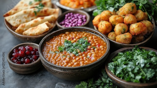 Spicy lentil stew, flatbread, sides, dark table, food blog