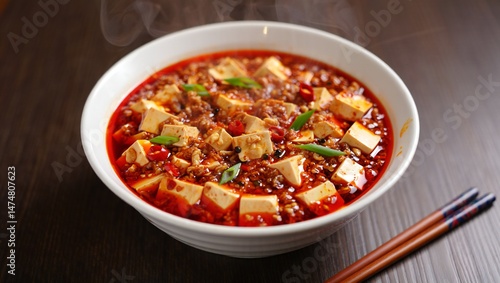 Spicy Mapo Tofu Dish in Bowl Steaming Hot Chinese Food