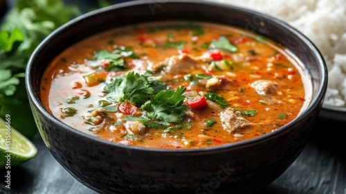 Spicy meat stew in a dark bowl, garnished with cilantro. Perfect for illustrating recipes, food blogs, or restaurant menus featuring hearty, flavorful dishes.