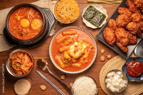 Spicy Rice Cake with Cheese or Teokbokki with spicy sauce Korean traditional food, Tteokbokki is Korean rice cake stick in spicy sauce Korean cuisine dish.