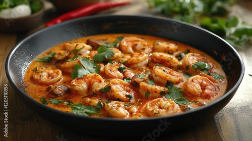 Spicy Shrimp Curry with Fresh Cilantro in Black Pan on Rustic Wooden Table
