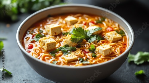 Spicy tofu ramen with fresh cilantro garnish.