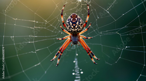 Spider in Web Close Up with Detailed Patterns and Green Background