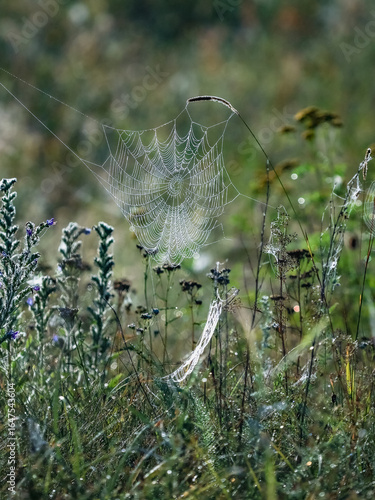 Spider web in the wet field in the morning