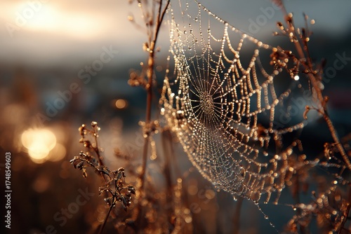 Spiderweb glistens with morning dew in golden hour light, captured at sunrise, showcases intricate details and natural beauty