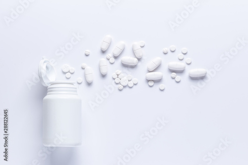 Spilled Pill Bottle isolated.Top view,.pharmacology concept. white pills
