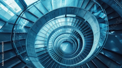 Spiral staircase inside a modern cylindrical building with glass floors