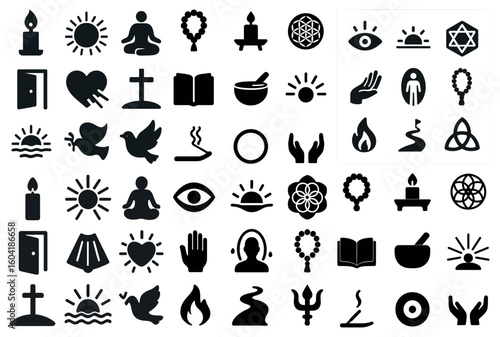 Spiritual and religious solid icons set – silhouette, outline, sacred symbols
