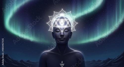 Spiritual Meditation Under Aurora with Chakra Symbol