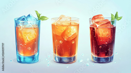 Splash cola, soda, cold tea or coffee with ice cubes. Splashing drink in glass cup with air bubbles. Isolated summer cocktail or whiskey alcohol beverage, Realistic 3d vector illustration, clip art