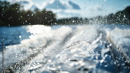 Splash of Adventure: The boat slices through the water, sending a splash of spray behind, symbolizing the rush and thrill of a thrilling adventure on the water.