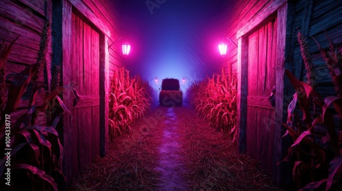 Spooky Cornfield Path with Pink Lighting and Hay Bale for Halloween Decor