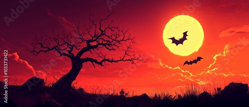 Spooky halloween background with silhouette dead tree and flying bat at night full moon