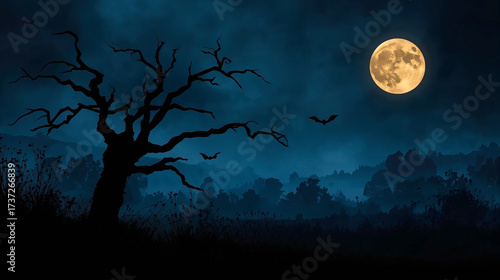 Spooky halloween background with silhouette dead tree at night full moon