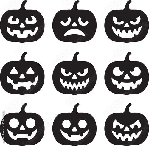 Spooky Halloween Elements Silhouette Vector Set Witch Flying on Broom with Bats Halloween Clipart Haunted House with Pumpkin and Bats Silhouette Design Creepy Halloween Scene with Ghosts and Full M