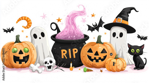 Spooky Halloween scene featuring carved pumpkins, ghosts, cauldron, and bats, creating festive atmosphere filled with fun and fright