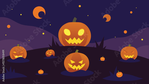 Spooky halloween scene featuring carved pumpkins under the moonlight and stars