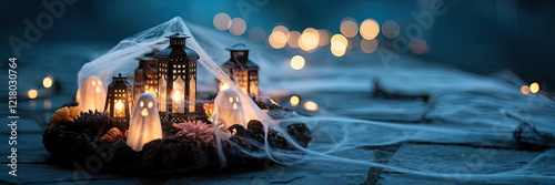 Spooky Halloween Scene Lanterns Ghosts Cobwebs