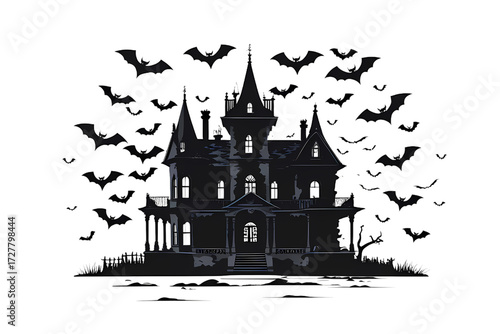 Spooky haunted house with bats flying around, perfect for Halloween illustrations and scary designs