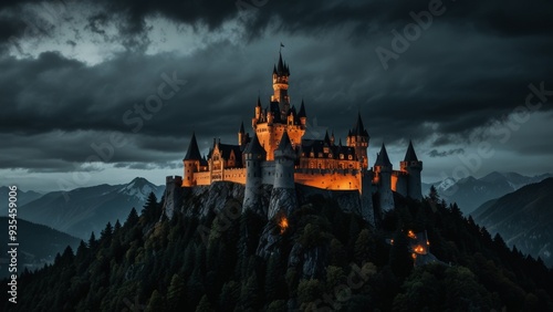 Spooky old medieval castle: Ancient eerie castle. Halloween, horror, fairytale background concept.