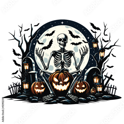 Spooky skeleton with evil pumpkins on full moon night, Halloween background illustration