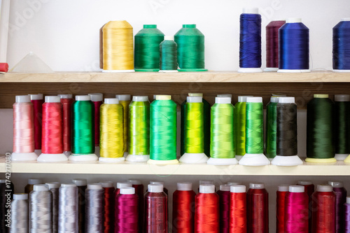 Spools of thread of various colors neatly arranged on wooden shelves, creating a visually appealing display for sewing and tailoring projects or facilities.