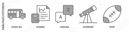 Sport, Astronomy, Language, Economy, School Bus editable stroke outline icons set isolated on white background flat vector illustration.