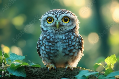 Spotted owl perched on a moss-covered branch in a lush forest during golden hour