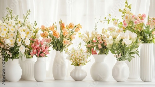 Spring arrangements displayed in elegant white vases create a fresh atmosphere against a soft background, emphasizing the beauty of spring arrangements with ample copy space.
