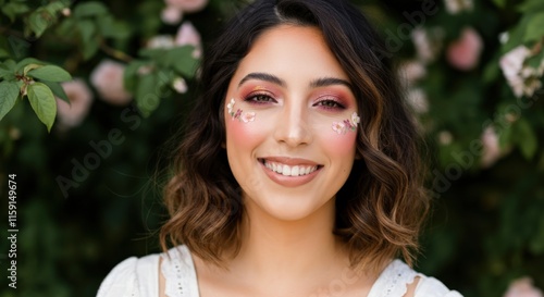 Spring beauty portrait of young hispanic female with floral makeup in blooming garden