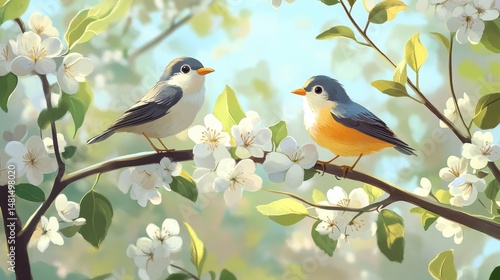 Spring Birds. Little Chicks and Sparrows Among Apple Tree Branches with White Flowers in Sunny May Garden