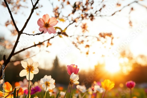 Spring blossoms at sunrise in colorful garden