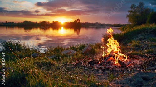 Spring Bonfire by the lake at Sunset. Coastal Camping. spring break