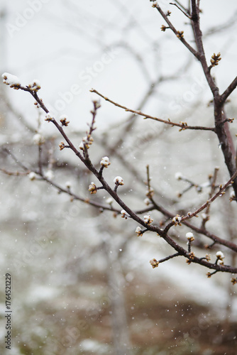 Spring buds on a tree coated with snow during unseasonal snowfall, reflecting unusual climate behavior