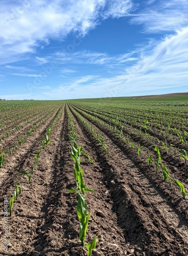 Spring Cornfield Rows Under Blue Sky