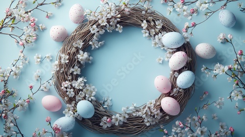 Spring easter wreath with decorative eggs and blossoms for holiday celebration